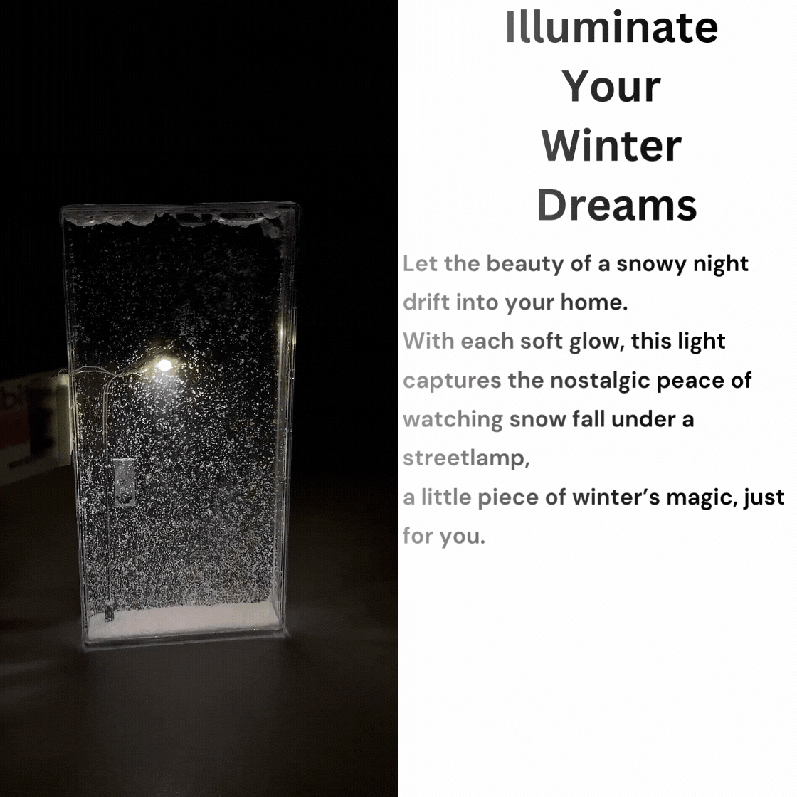 "Let your home hold a touch of winter’s quiet beauty. This light casts a soft glow over a snowy scene, filling your space with calm, nostalgia, and the magic of a quiet night."